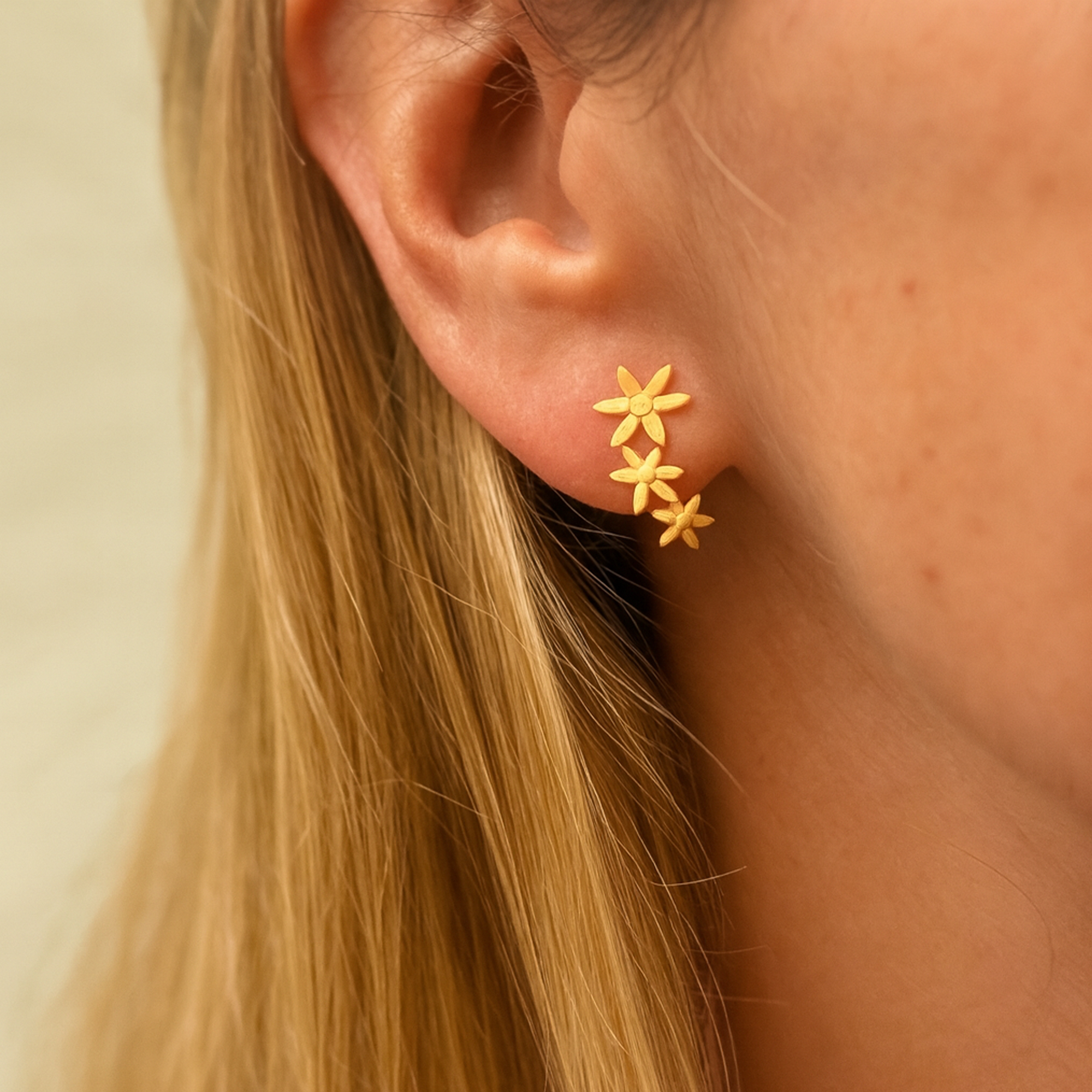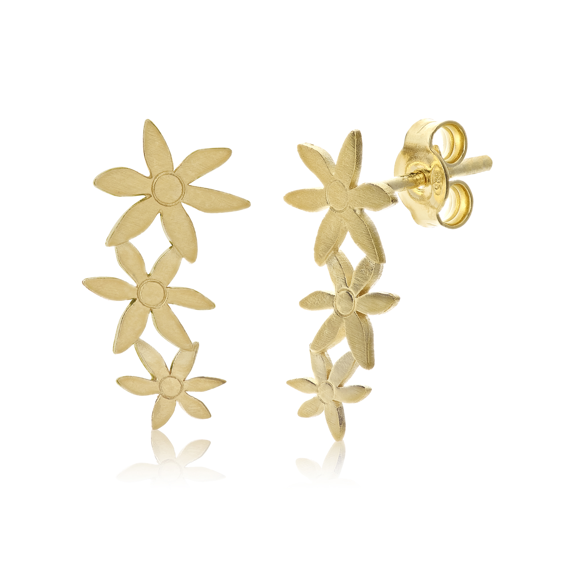 Arracades amb tres flors de mides diferents de plata 925mm i bany d'or de 18k amb acabat mat inspirat en la Flor de Safrà. Tanca a pressió.