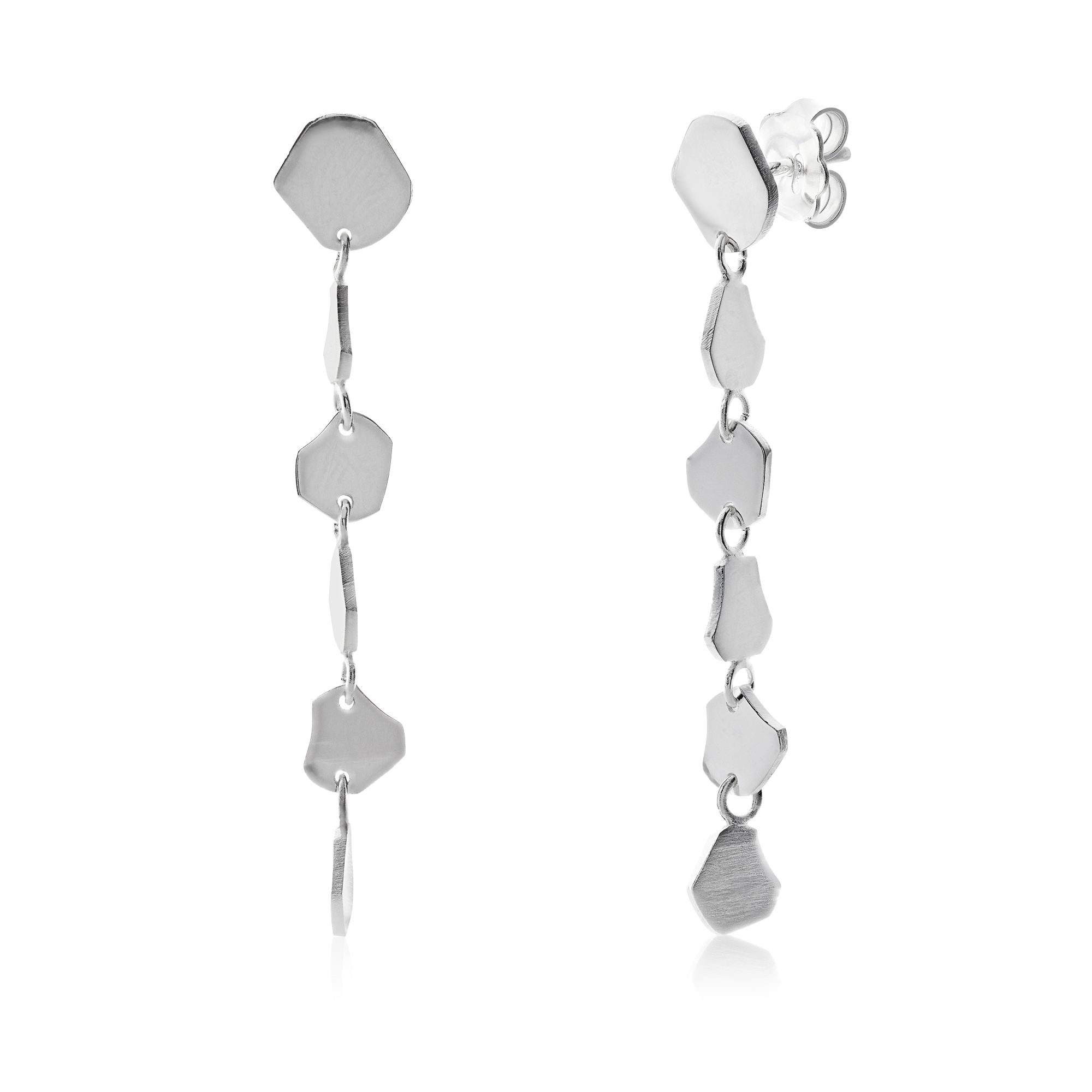 Arracades llargues de plata 925mm amb moviment inspirades en la pissarra de la llicorella. Formes irregulars acabades en plata polida i plata mat. Tanca a pressió.