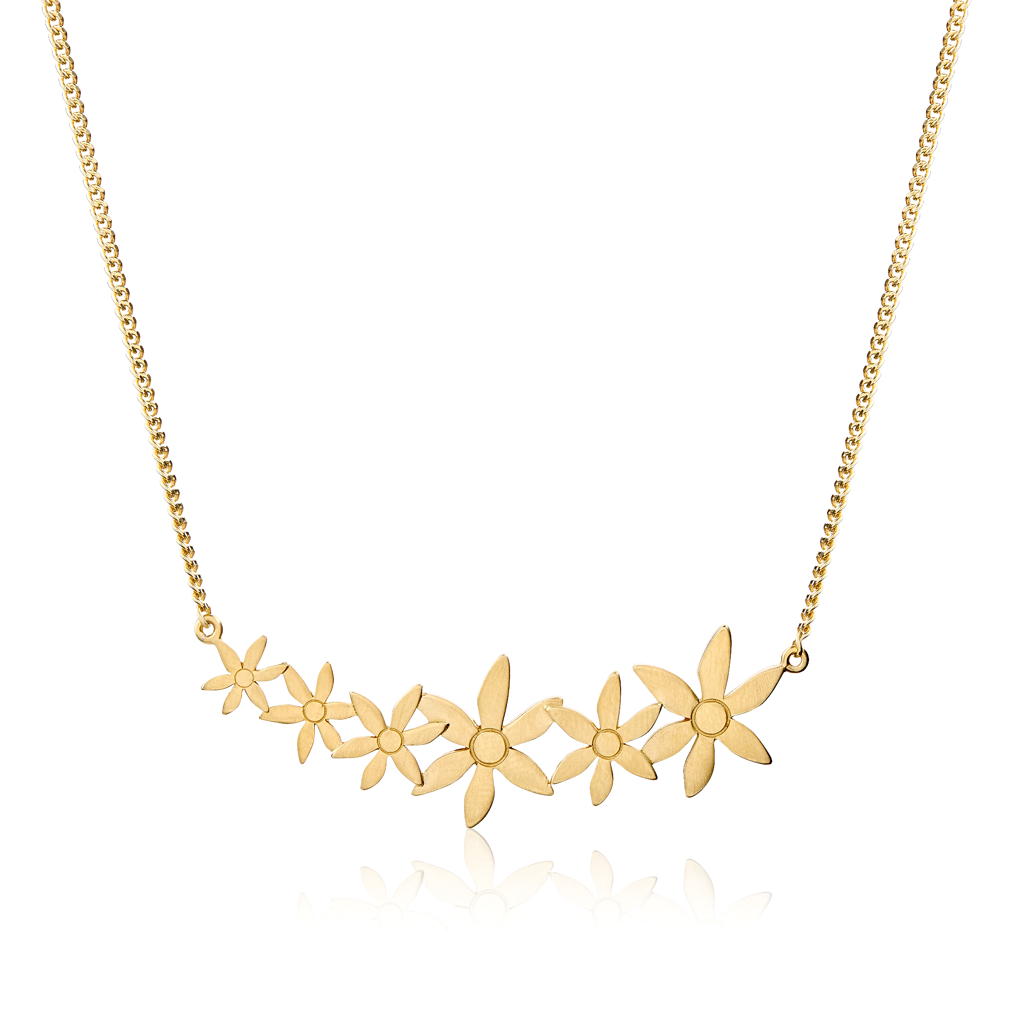 Collar amb 6 Flors de Safrà irregulars de plata 925mm i bany d'or de 18k. Cadena barbada de plata amb bany d'or. Tanca de mosquetó.