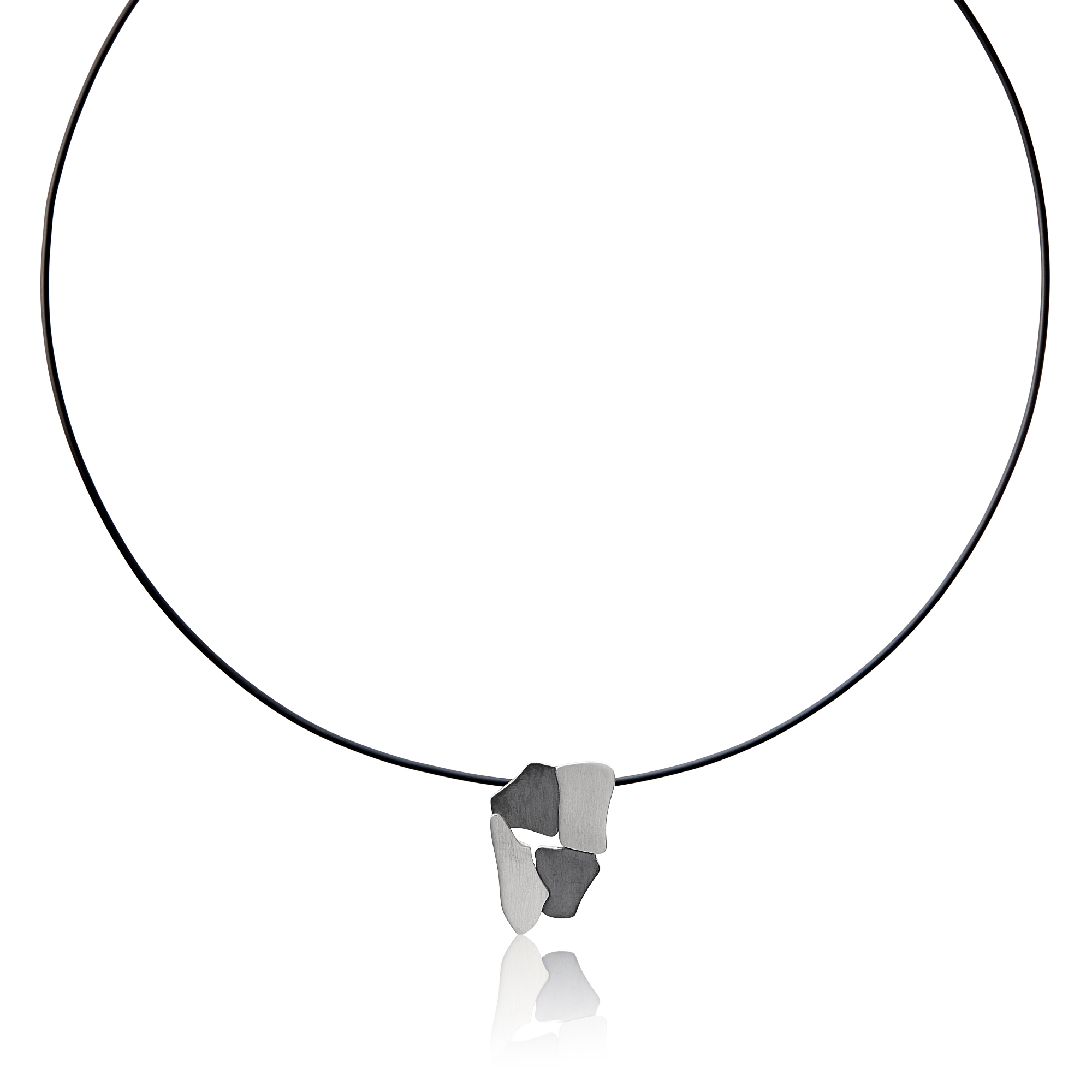 Penjoll de plata 925mm per home inspirat en la pissarra de la llicorella. Formes irregulars acabades en plata oxidada i plata mat. Cordó de silicona negra de 48cm de llarg amb tanca de click.