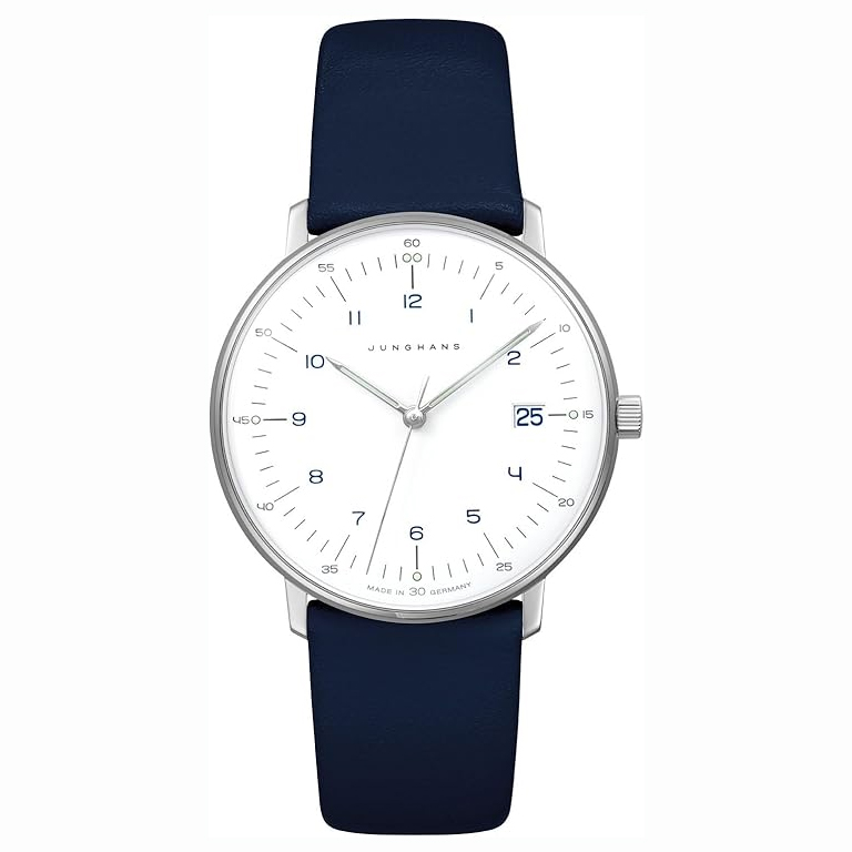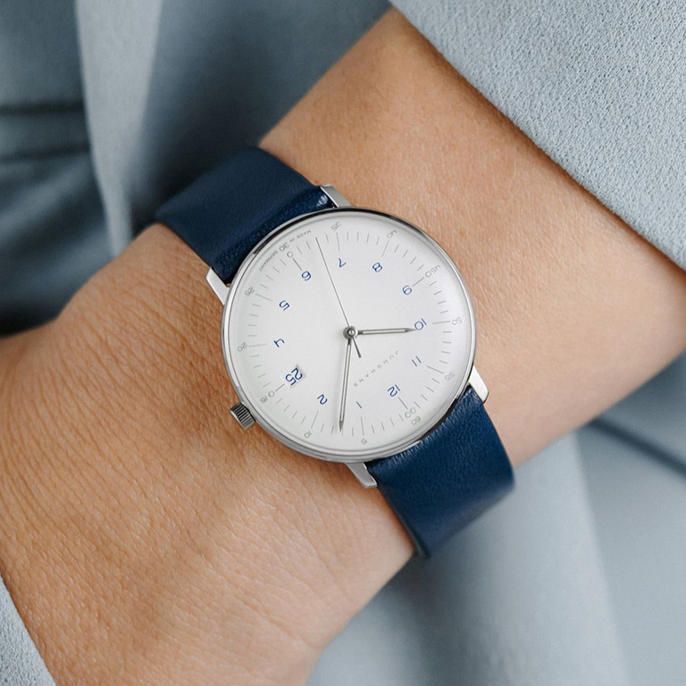 Rellotge Junghans Max Bill damen quars de color blau. Caixa d'acer de 32 mm de diàmetre i vidre sàfir convex reforçat. Esfera blanca amb números blaus i calendari. Corretja de pell blau marí.