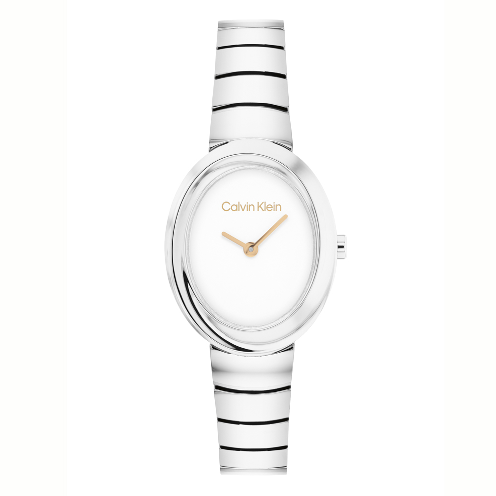 Rellotge Calvin Klein Twisted Bezel de quars. Caixa ovalada d'acer inoxidable de 24 mm de diàmetre i vidre mineral. Esfera blanca amb bisell platejat. Armis semi rígid platejat amb opció de treure malles i adaptar al canell. Impermeable 30m. 3 anys de garantia.